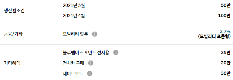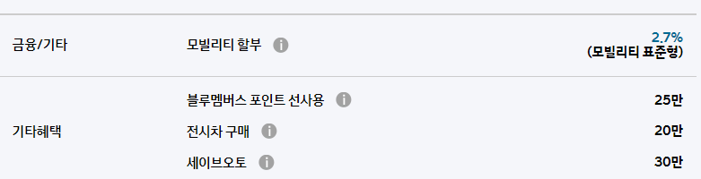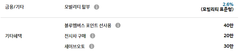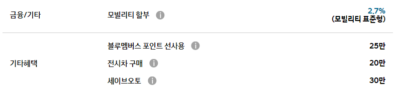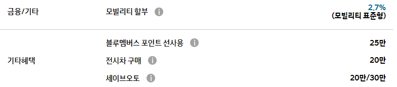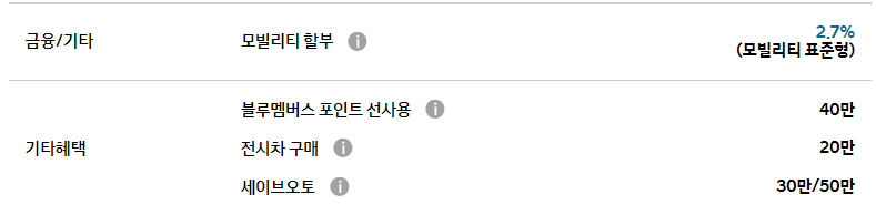 또한 모빌리티 할부, 블루멤버스 포인트 선사용, 전시차 구매 20만 원 할인 등의 기타 혜택도 존재합니다.