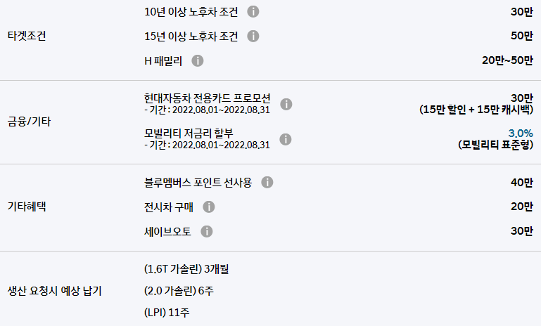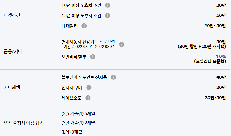 현대자동차 8월 판매조건, 현대차 납기 일정(2022)