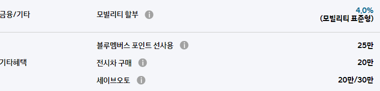 팰리세이드는 모빌리티 할부, 세이브 오토, 포인트 선사용의 기본적인 혜택만 제공되고 있습니다.