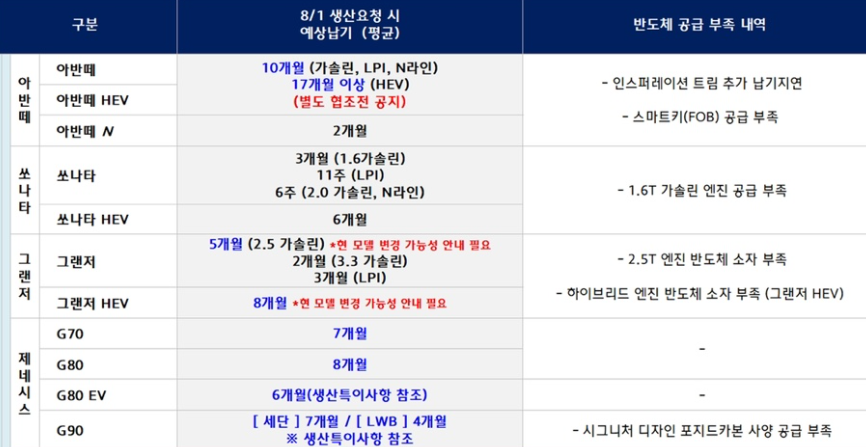또한, 최근 차량 반도체 부족 현상으로 대부분의 차량이 출고까지 상당기간 소요되고 있습니다. 8월 현대차 계약 시 차종별로 출고 대기기간과 납기 일정에 대하여도 알아보도록 하겠습니다.