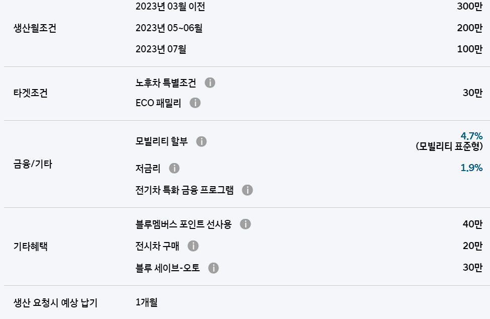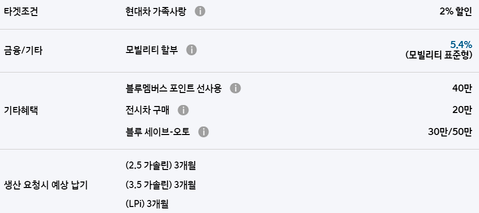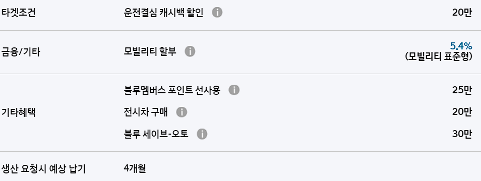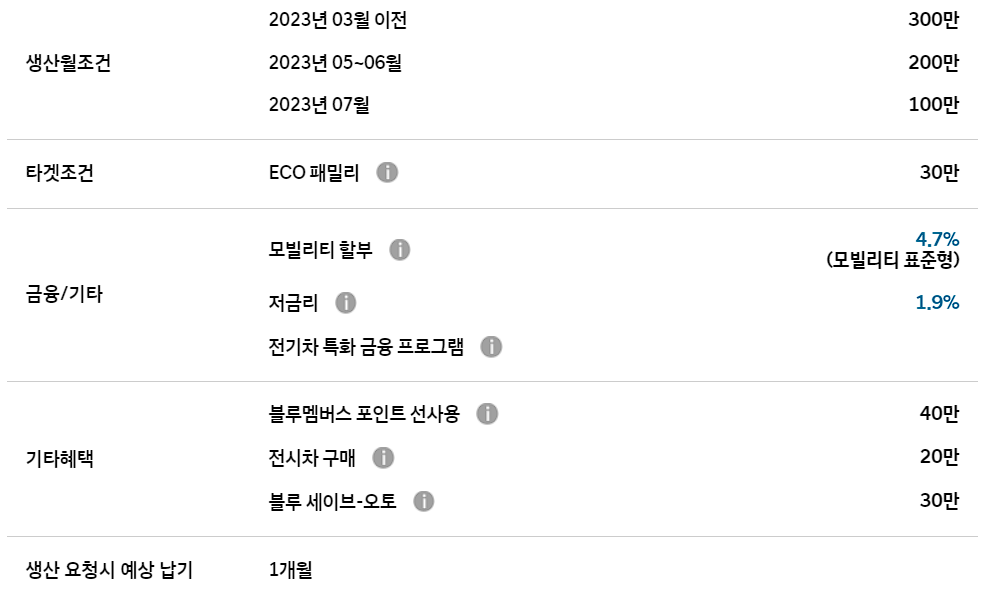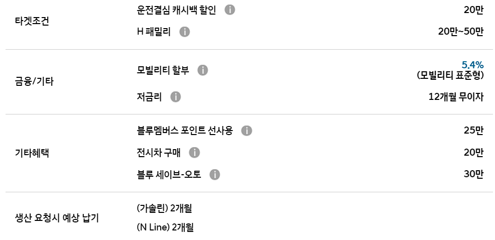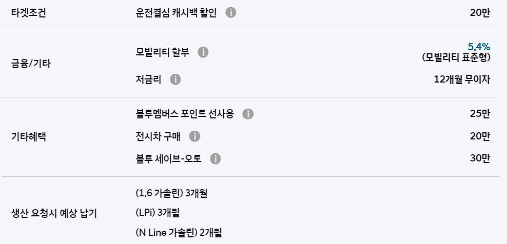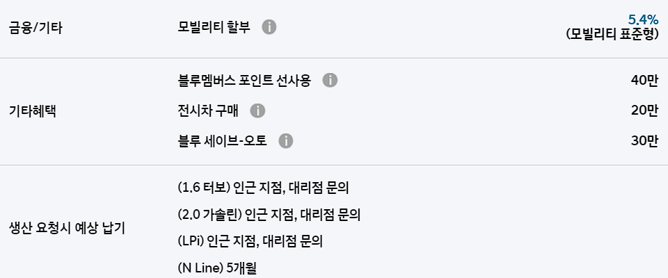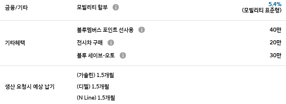 이외 블루멤버프 포인트 선사용, 전시차 구매 혜택, 블루 세이브 오토 등의 할인은 다른 차량들과 동일하게 제공합니다.