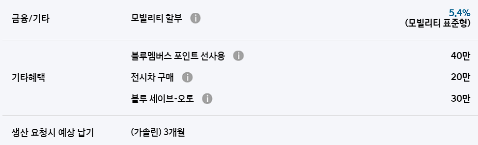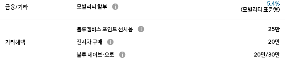블루멤버스 포인트 선사용, 전시차 구매 등을 통해서도 각가 25만원, 20만 원 추가 할인이 가능합니다.