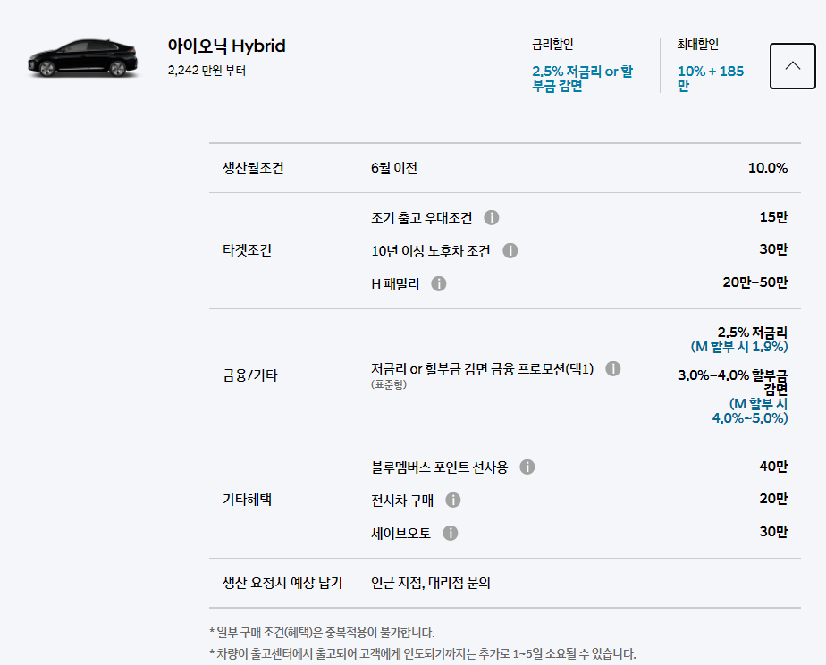 아이오닉의 경우 6월 이전의 생산차량에 최대 10%의 할인을 보여줍니다.