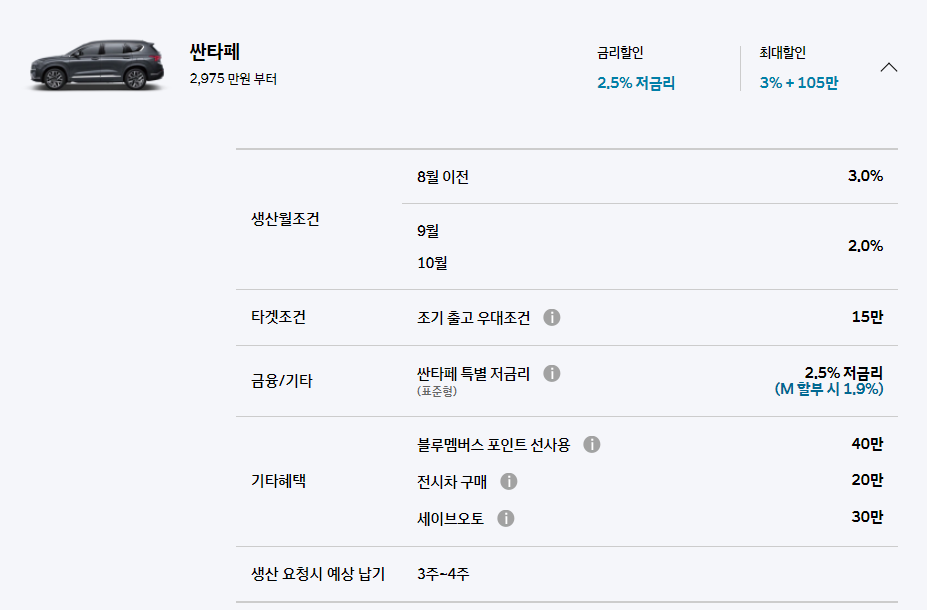 싼타페의 경우는 출고대기기간이 1달 이내로 짧습니다.