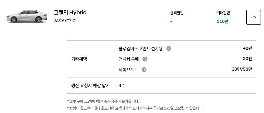코나와 그랜져의 하이브리드 경우 공통할인을 제외하군 추가할인이 존재하지 않습니다.