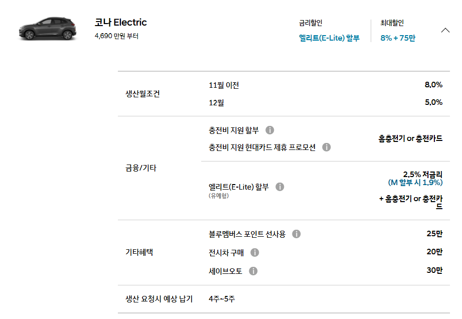 코나 전기차의 경우 11월 이전은 8% 할인, 12월 생산은 5% 할인을 제공합니다.