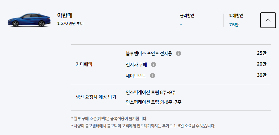 아반떼의 경우 인기차종으로 주문시 1달이상이 소요되기에 금리할인이 없습니다.
