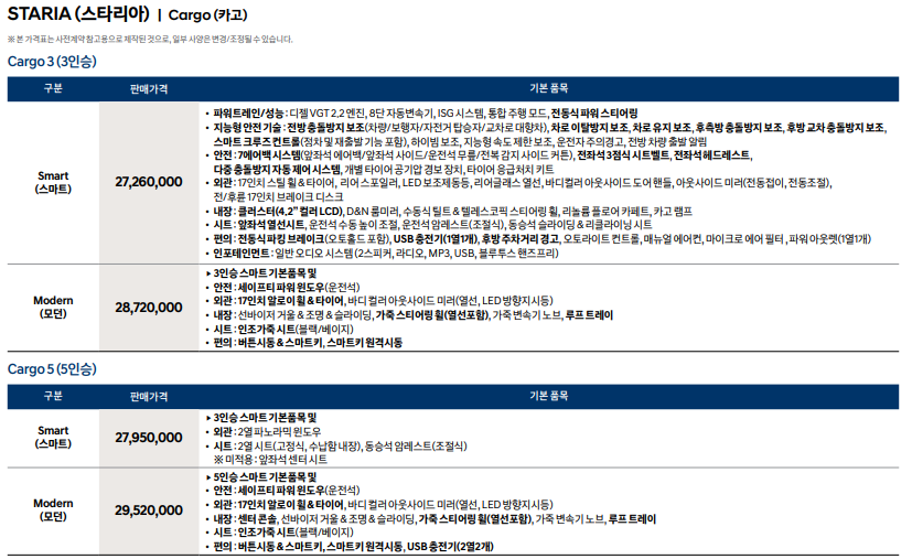 스타렉스처럼 3인승, 5인승으로 나누어져 출시하였고, 1열 2열 좌석에 따라 이러한 구분이 이루어지고 있습니다.