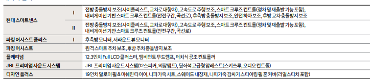 이중접합 차음 유리(앞면, 앞도어), 아웃사이드 미러(퍼들램프, 열선, 전동조절, 전동접이,