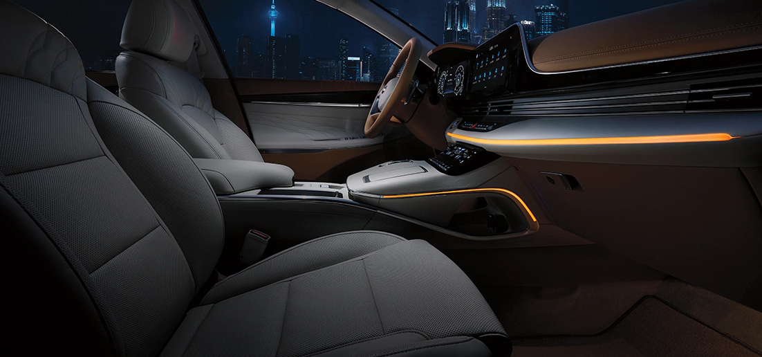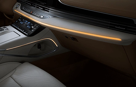 크래쉬패드 및 앞좌석 도어 가니쉬 하단에 은은한 조명을 적용하여 고급감을 전달합니다. AVN 설정 화면에서 고객이 직접 64가지 색상 및 전문가 추천 10가지 색상을 선택할 수 있습니다.