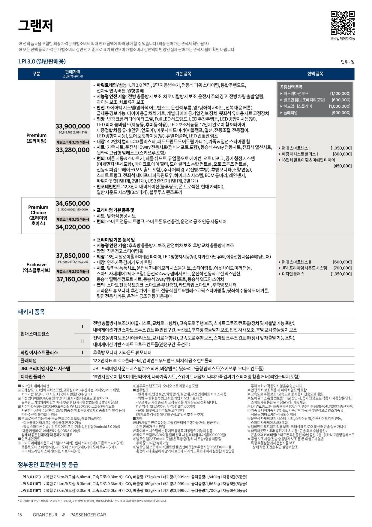 • 파워트레인/성능 : LPi 3.0 엔진, 6단 자동변속기, 전동식 파워 스티어링, 통합주행모드,
