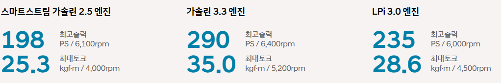 2.5 가솔린, 3.3 가솔린, 3.0 LPi 엔진으로 말이죠,