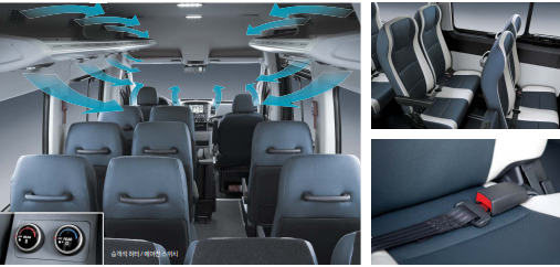 쏠라티는 15인승이라 하여도 좌석의 여유공간이 부족하지 않습니다. 오히려 통로의 경우도 항시 확보가 되기에 뒷좌석의 답답함은 조금 줄 것이고 차량 내 이동시 서서 이동할 수 있기 때문에 탑승객의 쾌적함을 보장하여 줍니다.