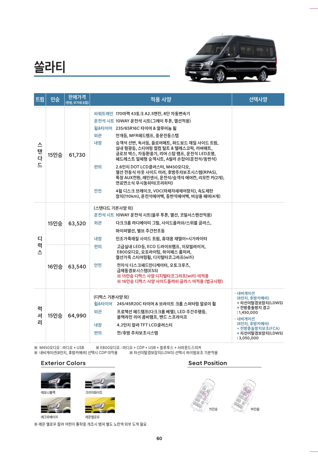 현대 그랜드 스타렉스 밴 (3인승 밴, 5인승 밴) 가격, 옵션, 가격표