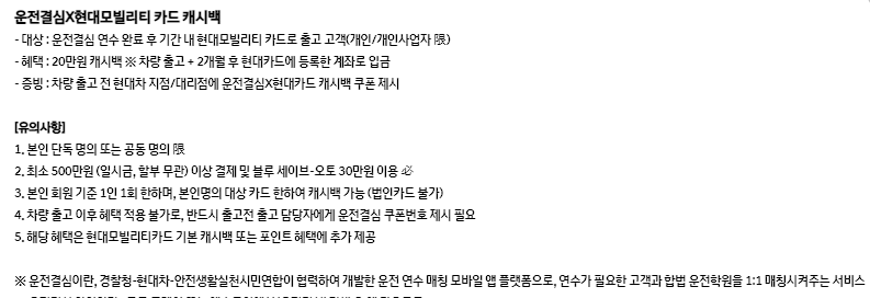 운전결심 할인 혜택은 운전결심 연수 완료 후 현대 모빌리티 카드로 출고를 한 고객을 대상으로 할인이 제공되며, 20만원의 캐시백이 운전 및 사회 초년생에게 제공됩니다.