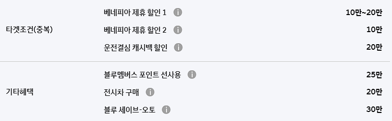 아반떼는 베네피아 제휴 할인, 운전결심 캐시백 할인, 블루멤버스 포인트 선사용 할인이 제공됩니다. 각각 10~20만 원, 20만 원, 25만 원의 할인 혜택이 제공됩니다.
