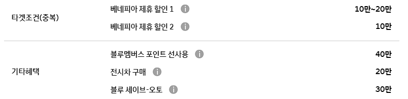 베네피아 제휴 할인은 베네피아 포인트 전환 고객이 현대차를 구매할 경우 제공되며, 포인트 전환은 50만 포인트 미만은 10만원 할인이 가능하며 50만 포인트 이상의 경우 20만 원 포인트 할인이 됩니다.