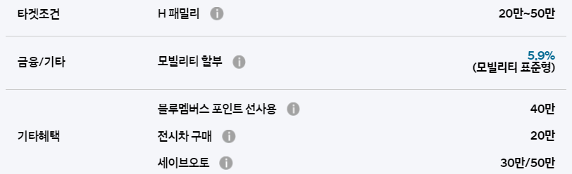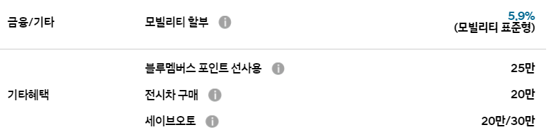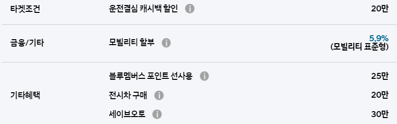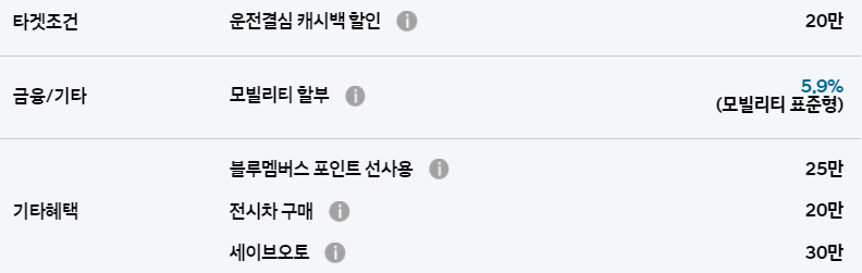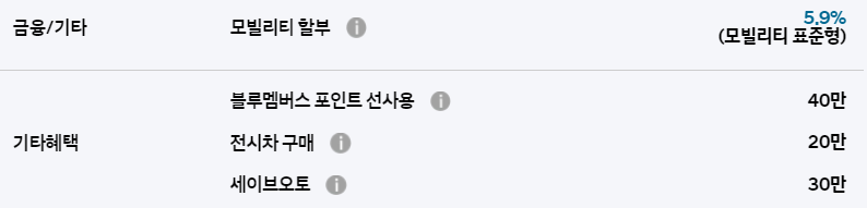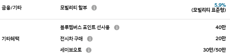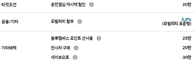 블루멤버스 포인트 할인, 전시차 구매 할인, 세이브 오토 할인 등의 혜택은 다른 차종과 동일하게 적용됩니다.