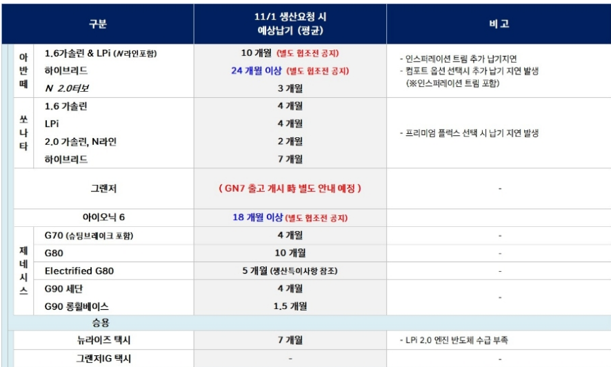 현대차 11월 납기 일정은 10월에 비하여 길어졌습니다.