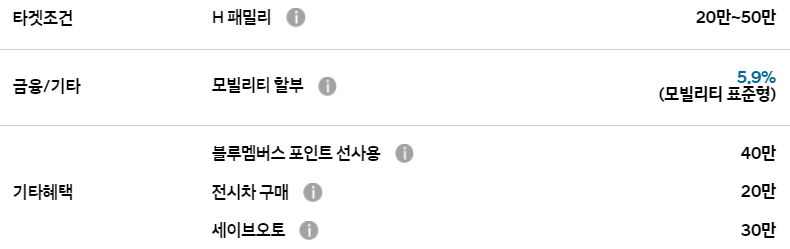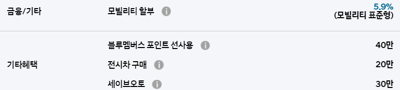 블루멤버스 포인트 할인, 전시차 구매 할인, 세이브 오토 할인 등의 혜택은 다른 차종과 동일하게 적용됩니다.