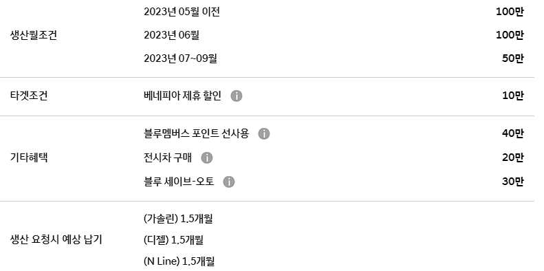생산 월 조건에 따라서 최대 200만원의 할인도 추가로 받을 수 있습니다.