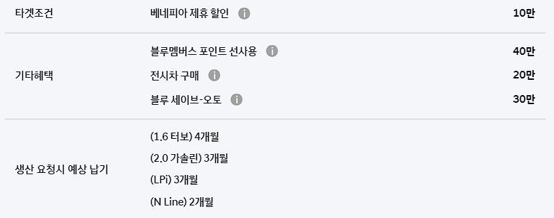 소나타 구매 고객은 베네피아 제휴 할인, 블루멤버스 포인트 선사용, 블루 세이브 오토 할인 혜택을 받을 수 있습니다.