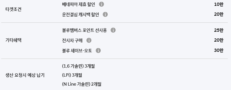 운전결심 캐시백 할인은 20만 원이 추가로 제공되며, 블루멤버스 포인트 선사용도 25만 포인터 사용이 가능합니다.