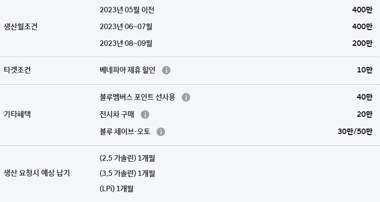 생산 월 조건에 따라서 최대 200만원의 할인도 추가로 받을 수 있습니다.