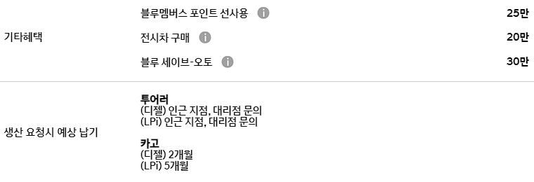 운전결심 캐시백 할인은 20만 원이 추가로 제공되며, 블루멤버스 포인트 선사용도 25만 포인터 사용이 가능합니다.