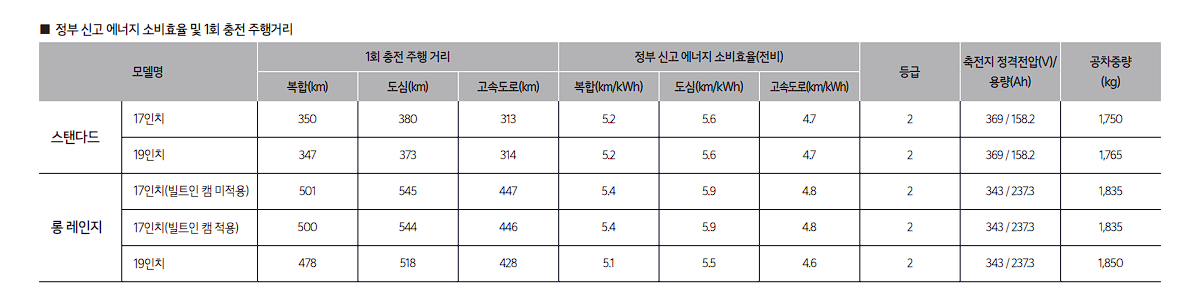 하지만, 롱레인지 모델이 배터리 용량이 더 크기에 가격도 400만원 비쌉니다. 롱레인지 출력과 토크는 스탠더드와 동일합니다. 배터리 용량이 81 kwh로 커서 주행거리가 약 30%가 늘어났습니다.