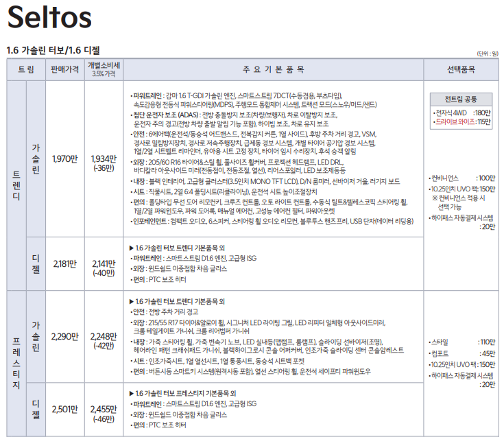 셀토스 1.6 디젤 프레스티지 2,501만원