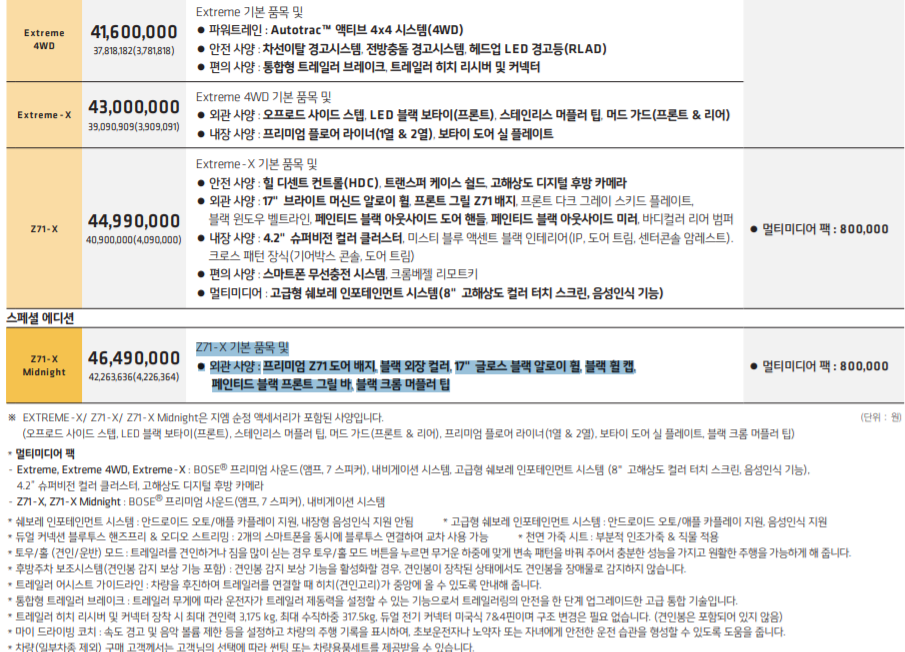 | Extreme 기본 품목 포함 ● 파워트레인 : Autotrac™ 액티브 4x4 시스템(4WD) ● 안전 사양 : 차선이탈 경고시스템, 전방충돌 경고시스템, 헤드업 LED 경고등(RLAD) ● 편의 사양 : 통합형 트레일러 브레이크, 트레일러 히치 리시버 및 커넥터 |