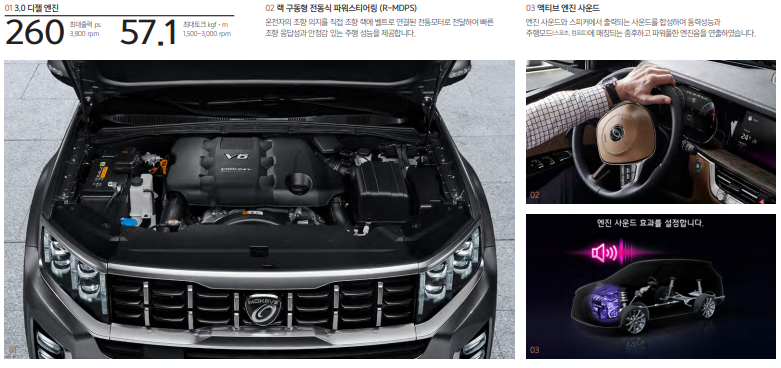 •파워트레인 : V6 S2 3.0 디젤 엔진, 8단 자동변속기(수동겸용, 부츠타입), 랙 구동형 전동식 파워 스티어링(R-MDPS),