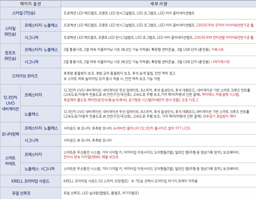 | 스타일 •컴포트 •드라이브 와이즈 •모니터링 팩 •스마트 커넥트 •KRELL 프리미엄 사운드 •듀얼 선루프 •[TUON] 후석 엔터테인먼트 시스템 |