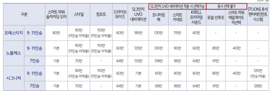 | 2021 신형 카니발 프레스티지, 노블레스 선택 옵션 |