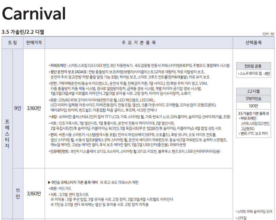 | 2021 신형 카니발 프레스티지, 노블레스 7,9,11인승 선택 옵션 |