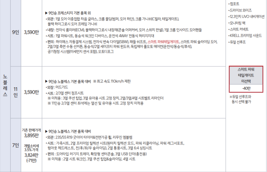 각각의 인승과 엔진에 따라서 프레스티지, 노블레스, 시그니처로 3가지 트림으로 나누어져 있습니다.