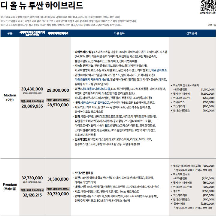 2021 투싼 하이브리드 모던 선택옵션