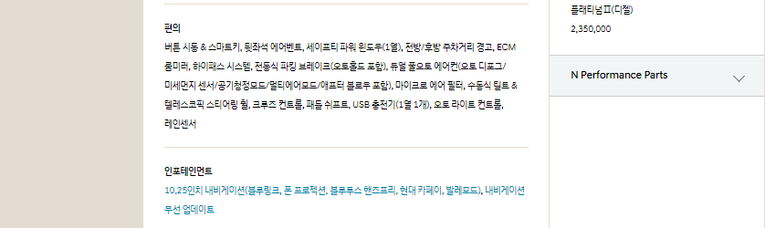 n 라인 전용 시트, 핸들, 전자식 변속 버튼, 크래쉬패드 레드 포인트)