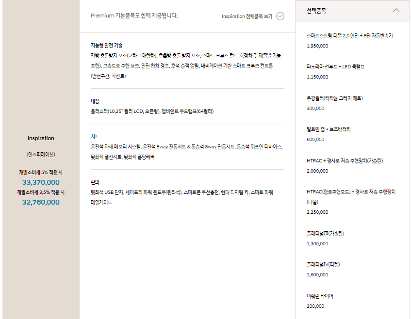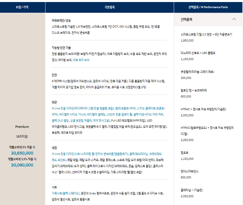 투싼 n라인 프리미엄 기본 품목 포함 이외