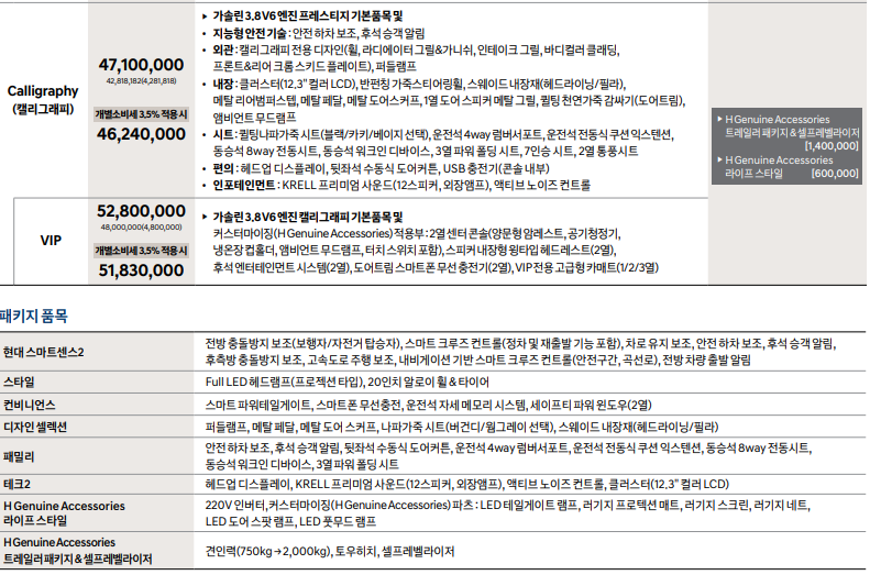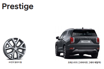 팰리세이드는 익스클루시브, 프레스티지, 캘리그래피 총 3가지 트림으로 나누어져 있습니다.