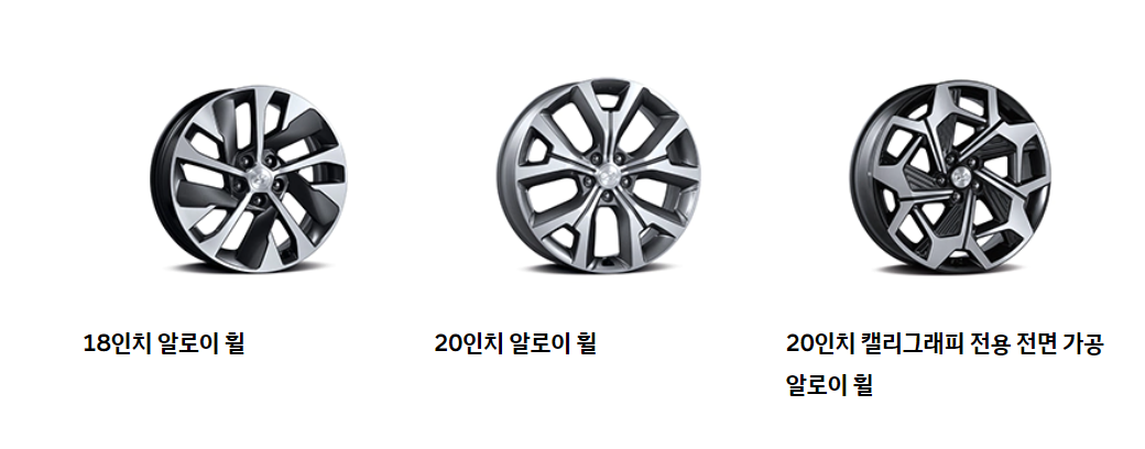 상위 옵션, 트림에 따라서 20인치 알로이, 캘리그래피 전용 20인치 휠이 적용되고 있습니다.