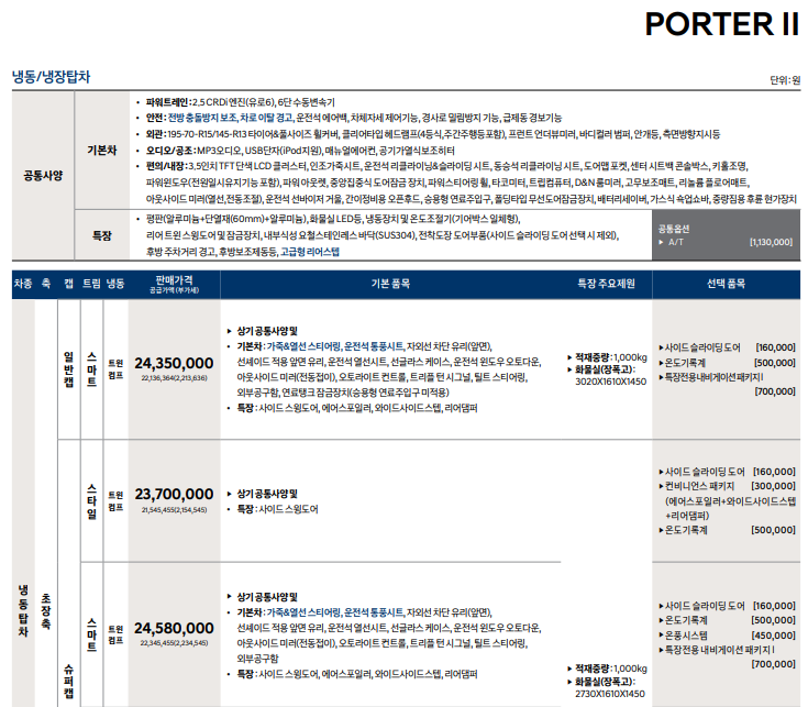 포터 2 탑차, 냉장차, 특장차 어떠한 사양이 존재?