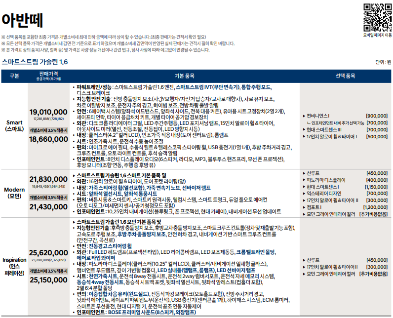 아반떼 1.6 가솔린 가격표