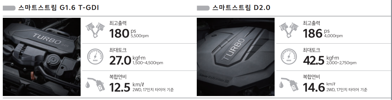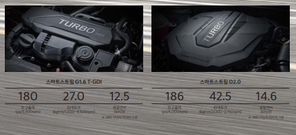 최고 출력 180마력, 최대토크 27, 복합 연비 12.5km/l를 보여줍니다.