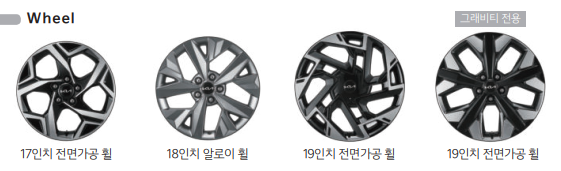 스포티지 휠은 17인치, 18인치, 19인치 휠로 다양한 모양 휠 선택이 가능합니다.