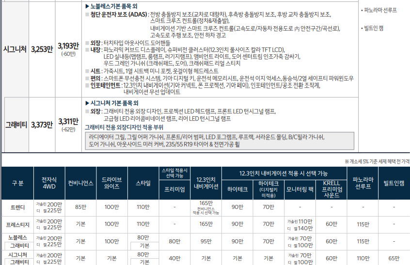 올 뉴 스포티지는 트렌디, 프레스티지, 노블레스 (그래비티), 시그니처 (그래비티) 트림으로 나누어져 있습니다.