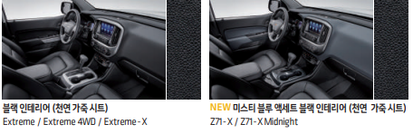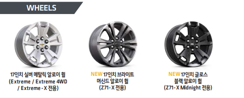 ● 외관 사양 : 프리미엄 Z71 도어 배지, 블랙 외장 컬러, 17"글로스 블랙 알로이 휠, 블랙 휠 캡,