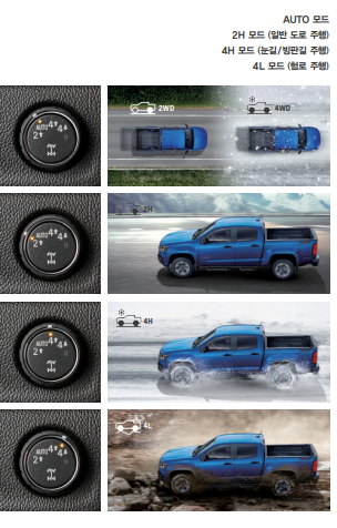 Autotrac TM Active 4x4 시스템은 노면 상태에 따라 Auto/2H/4H/4L 모드로 설정하여