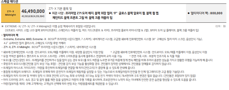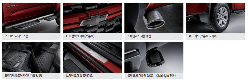 ● 외관 사양 : 오프로드 사이드 스텝, LED 블랙 보타이(프런트), 스테인리스 머플러 팁, 머드 가드(프런트 & 리어)